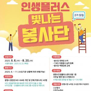 광명시(시장 박승원) 인생플러스센터는 오는 6일부터 20일까지 중장년 세대의 전문성과 경험을 지역사회에 환원하는 ‘2025년 인생플러스 빛나는 봉사단’ 2기에 참여할 봉사자…
