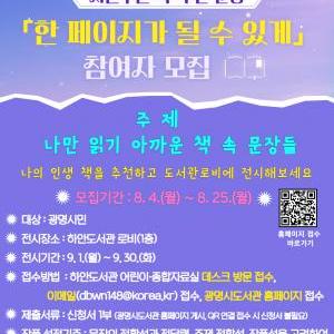 광명시(시장 박승원) 하안도서관은 오는 4일부터 25일까지 시민이 직접 추천한 책 속 한 문장을 전시하는 ‘한 페이지가 될 수 있게’ 참여자를 모집한다.이번 사업은 시민이 감명…