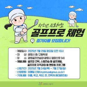 광명도시공사는 27일까지 광명골프연습장에서 진행하는 ‘청소년 골프 프로 진로체험 프로그램’ 참가자를 모집한다고 밝혔다.청소년 골프 프로 진로체험 프로그램은 7월 29일 화요일…