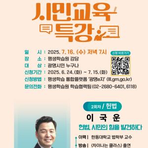광명시(시장 박승원) 평생학습원은 오는 7월 15일까지 ‘건강한 시민으로 살아가기 위한 시민교육 특강’ 2회차 참여자를 모집한다.이번 특강은 헌법의 의미와 가치에 대한 사회적…