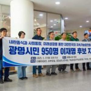 대한민국의 지속가능발전을 염원하는 단체와 광명시민 950명이 27일 광명시평생학습원에서 더불어민주당 이재명 대통령 후보에 대한 지지를 선언했다.지지선언에 참여한 이들은 국제사회의…