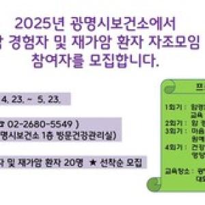 광명시 보건소는 오는 5월 23일까지 재가암환자와 암 경험자를 대상으로 자조모임 참여자 20명을 선착순으로 모집한다.이번 자조모임은 암 극복 사례와 치료 경험을 공유하며, 심리적…