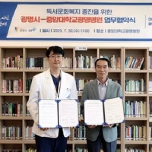 광명시와 중앙대학교광명병원이 병원 내 환자와 보호자에게 책을 통한 위로와 회복의 기회를 제공하기 위해 손을 맞잡았다.양 기관은 30일 오전 중앙대학교광명병원 마음심(心)터…