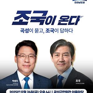 조국혁신당이 2026년 6·3 전국동시지방선거를 앞두고 전남 곡성에서 지역 밀착형 정책설명회를 연다.조국혁신당은 오는 12월 26일(금) 오후 6시, ‘곡성군 군민회관’ 어울마당…