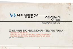 정부는 내년 SOC 예산을 올해 22조1000억원에서 4조4000억원 준 17조7000억원으로 책정했다. 정부의 11조5000억원 규모 지출 구조조정 중 가장 큰 비중을 차지한 것이 SOC 예산이었다. 하지만 국회 국토교통위는 정부안에서 2조3451억원을 증액해 예산결산특별위원회에 넘겼다. 지역구 의원들의 민원성 쪽지 예산과 SOC 예산 감소 비판 여론이 반영된 결과였다. 정창수 나라살림연구소장은 20일 “내년 SOC 예산이 올해보다 줄어들었다는 일부의 주장은 타당하지 않다”며 “표면적으로는 SOC 예산이 줄었지만 SOC 예산 이월 예상액을 감안하면 사실상 내년도 SOC 예산 규모는 올해와 비슷한 수준”이라고 말했다.