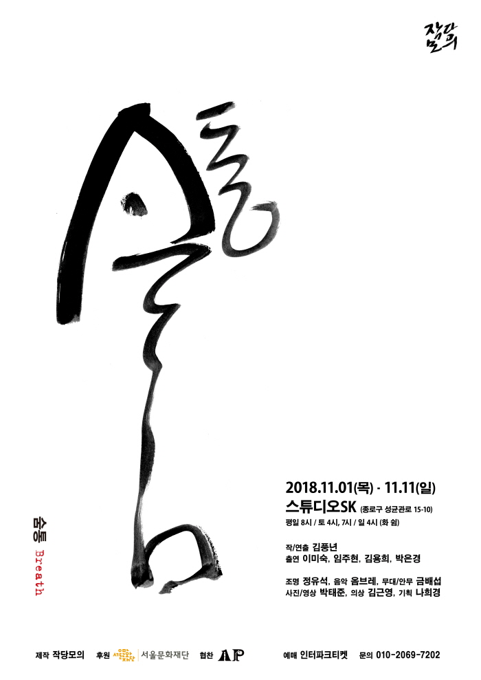 ❍ 공연명: 숨통❍ 공연일시: 2018년 11월 8일(목) 오후 8시❍ 공연장소: 스튜디오SK (성균관로 15-10)❍ 관람연령: 만 13세(중학생) 이상❍ 신청기한: 11월 5일(월) 까지❍ 후원: 작당모의* 공연 상세 설명: http://ticket.interpark.com/Ticket/Goods/GoodsInfo.asp?GoodsCode=18014371※ 문화나눔은 개인정보보호 규정에 따라 신청시 개인정보 제공 동의가 필요합니다. 아래 링크를 통해 신청하시면 됩니다. 문화나눔 선정 대상자 분들께는 별도로 문자 안내를 드릴 예정입니다. |