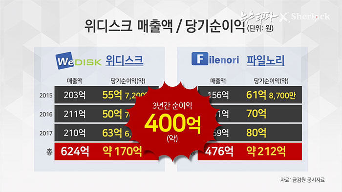 취재진은 양 씨 회사의 재무제표를 확인해 봤다. 앞서 설명한 불법적 사업구조로 얼마나 많은 매출과 이익을 내고 있는지 확인하기 위해서였다. 결과는 놀라웠다. 금융감독원 기업공시자료에 따르면, 웹하드 업계 1위 위디스크의 지난 3년 간 매출액은 624억 원, 순이익은 170억 원에 달했다. 2위인 파일노리도 지난 3년 간 약 476억 원의 매출을 올렸고 212억 원의 순이익을 낸 것으로 확인됐다. 지난해 파일노리의 매출액 대비 순이익율은 50%가 넘었다. 사실상 땅짚고 헤엄치기식 사업을 해 온 것이다.