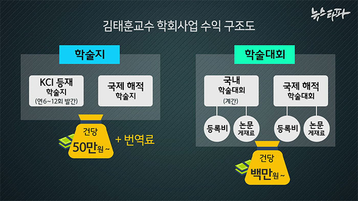 김태훈 교수가 운영하는 학술단체 조직의 수익은 국내외 학술지와 학술대회 사업을 통해 창출된다.