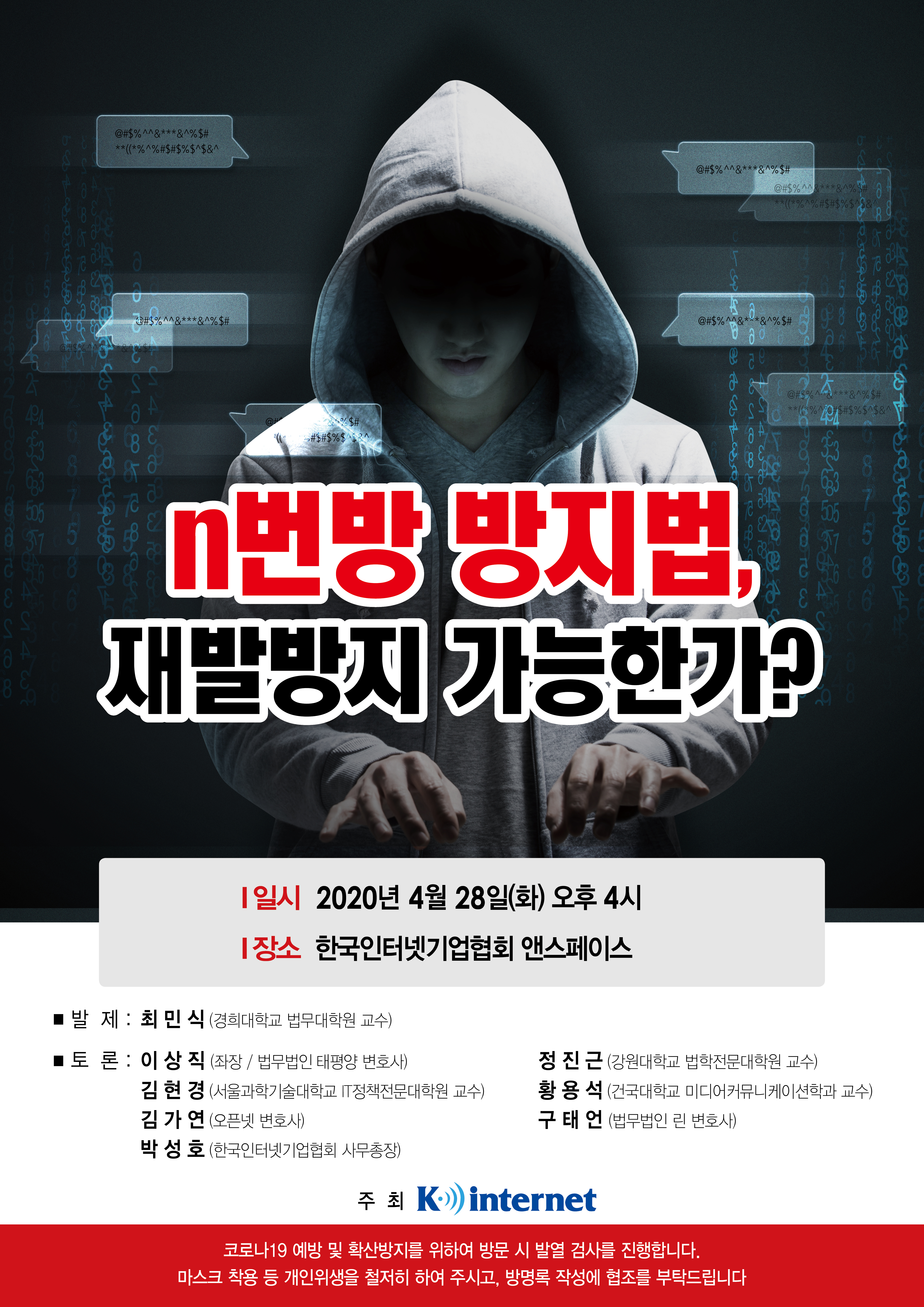 2020. 4. 28. 인터넷기업협회가 주최한 “n번방 방지법, 재발방지 가능한가?” 토론회에 오픈넷 김가연 변호사가 토론자로 참가했습니다. 이번 토론회는 최근 텔레그램 n번방 사건을 계기로 디지털성범죄자에 대한 처벌강화와 함께 정보통신서비스제공자에 대한 사전적 조치의무 등의 도입을 목적으로 하는 법률 개정안이 다수 발의되고 있는 상황에서, 소위 ‘n번방 방지법’이라 불리고 있는 관련 법률 개정안의 내용이 반복되는 디지털성범죄의 재발방지에 효과적으로 기능할 수 있는지, 문제가 있다면 어떤 내용의 보완이 필요한지에 대하여 각계 전문가의 의견을 듣고 올바른 논의방향을 제언하고자 하는 목적으로 개최되었습니다.