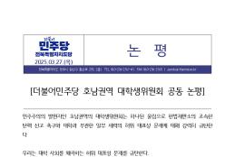 목, 2025/03/27- 00:00 에 admin 에 의해 제출됨 관련 개인/그룹 민주당 전북도당 정당 더불어민주당 지역 전북 카테고리 보도자료·성명·논평 25.03.27[논평]더불어민주당_호남권역_대학생위원회_공동.hwp20250327더불어민주당 호남권대학생위원회 공동 논평 포스터.jpg 링크 https://jeonbuk.theminjoo.kr/party/sub/news/view.php?brd=60&post=1615&board_id=briefing Like 0 Dislike 0 댓글 달기 이름 제목 Comment 저장 Preview Leave this field blank