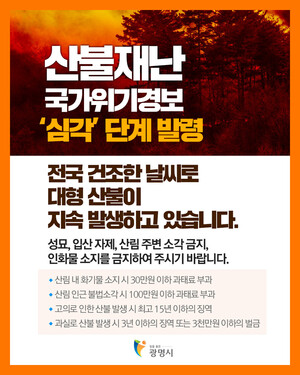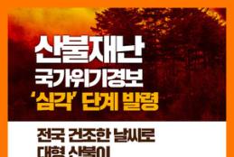 산불 재난 국가위기경보 ‘심각’ 단계 발령 중입니다.전국 곳곳에서 대형 산불이 발생하고 있습니다.작은 부주의가 한순간에 대규모 피해로 이어질 수 있습니다.모든 시민 여러분께서는 산불 방지 수칙을 철저히 지켜주시기 바랍니다. 산불 예방을 위한 행동 수칙- 산림 내 흡연 금지- 산림인접지역 소각 금지- 영농부산물은 소각 대신 파쇄 처리- 산림 내 지정 장소 외 취사 금지- 산림 인근 공사 시 화기 취급 각별히 주의 산불 발생 시 행동 요령- 산불 발견 즉시 119 신고- 산행 중에는 계곡부를 피해 빠르게 하산- 대피하지 못한 경우 →