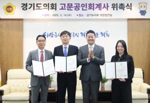 경기도의회(의장 김진경)는 14일 의장 접견실에서 ‘경기도의회 고문공인회계사 위촉식’을 열고 3명의 고문공인회계사를 위촉했다.이날 위촉식에는 박춘화, 전민영, 조기철 등 3명의 공인회계사가 김진경 의장으로부터 위촉장을 받고, 경기도 재정운용과 관련한 의견을 교환했다.위촉된 고문공인회계사들은 2027년 5월까지 향후 2년간 경기도의회, 도청, 교육청 및 산하 공공기관을 대상으로 세무․회계 관련 자문과 재정 관련 법령 제·개정에 따른 변화 예측 등 다양한 역할을 수행할 예정이다.경기도의회는 2013년부터 세무․회계 분야의 전문성을 강화