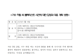 수, 2025/05/14- 00:00 에 admin 에 의해 제출됨 관련 개인/그룹 민주당 중앙당 정당 더불어민주당 지역 미특정 카테고리 보도자료 250514_가수_하림_씨_블랙리스트_사건에_대한_입장과_대응_계획_성명_K_문화강국위원회_문화예술위원회.pdf공유 공유하기 닫기페이스북트위터카카오톡URL 복사 링크 https://theminjoo.kr/main/sub/news/view.php?sno=0&brd=188&post=1211328&search= Like 0 Dislike 0 2 views 댓글 달기 이름 제목 Comment 저장 Preview Leave this field blank