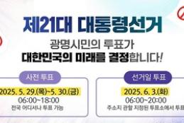 광명시가 제21대 대통령 선거 시민 참여를 독려하고 나섰다. 시는 오는 6월 3일 대선이 20일 앞으로 다가옴에 따라 시민들이 주권자로의 권리와 책임을 다할 수 있도록 투표 참여를 적극 독려하는 다양한 캠페인을 벌인다고 14일 밝혔다. 이를 위해 시는 ▲시 전역 옥외광고물 설치 ▲공식 누리집·SNS 채널 활용 투표 독려 ▲시민참여 캠페인 전개 ▲투표 참여 방송 협조 요청 등 전방위적인 홍보 전략을 펼치고 있다.우선 시청사에 대형 현수막을 비롯해, 19개 동 행정 게시대, 저단 현수막 34개소, 도서관·평생학습원 현수막을 포함해 IP