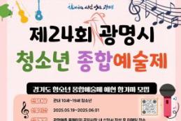 광명시(시장 박승원)가 오는 19일부터 6월 1일까지 예술적 재능을 지닌 청소년을 대상으로 ‘2025년 광명시 청소년 종합예술제’ 참가자를 모집한다.광명시가 후원하고 (사)한국예총 광명지회가 주관하는 이번 예술제는 제24회 대회로, 오는 6월 13일부터 14일까지 광명시민회관에서 열린다.광명시 청소년 종합예술제는 ‘경기도 청소년 종합예술제’의 지역 예선에 해당하며, 최우수 수상자에게는 본선인 경기도 대회 참가 자격이 주어진다.대회는 ▲음악(한국음악 성악·기악, 서양음악 합창·관악합주) ▲무용(한국무용 독무·군무, 외국무용 독무·군무