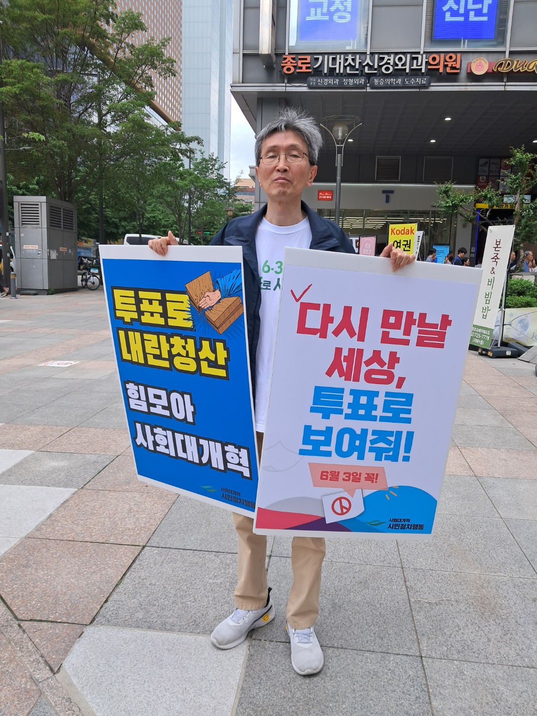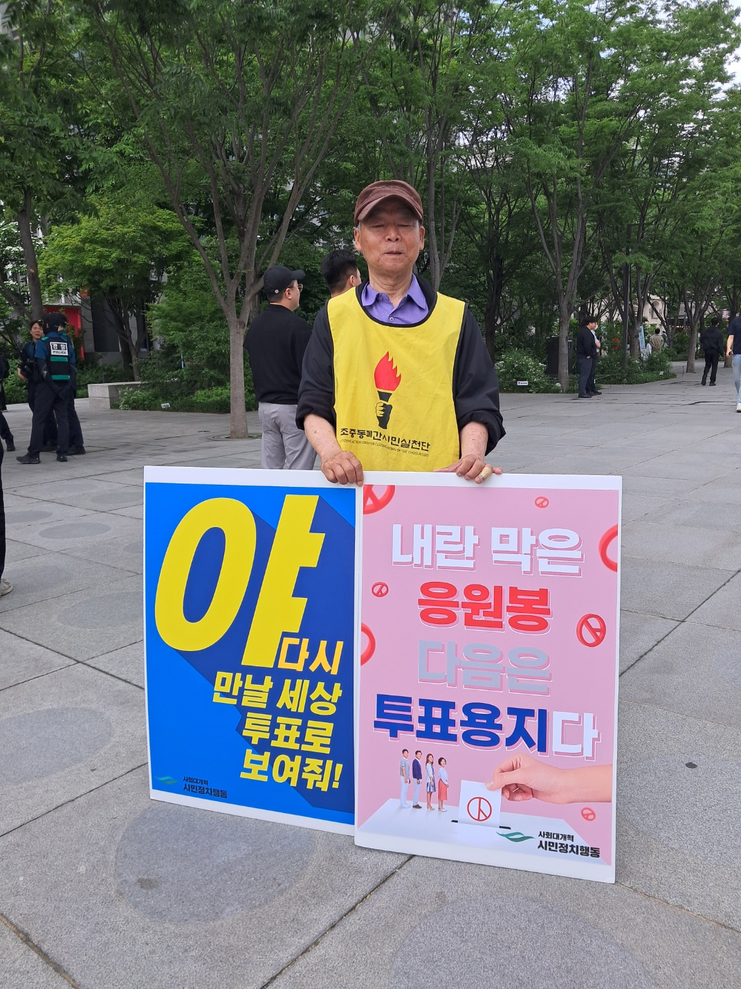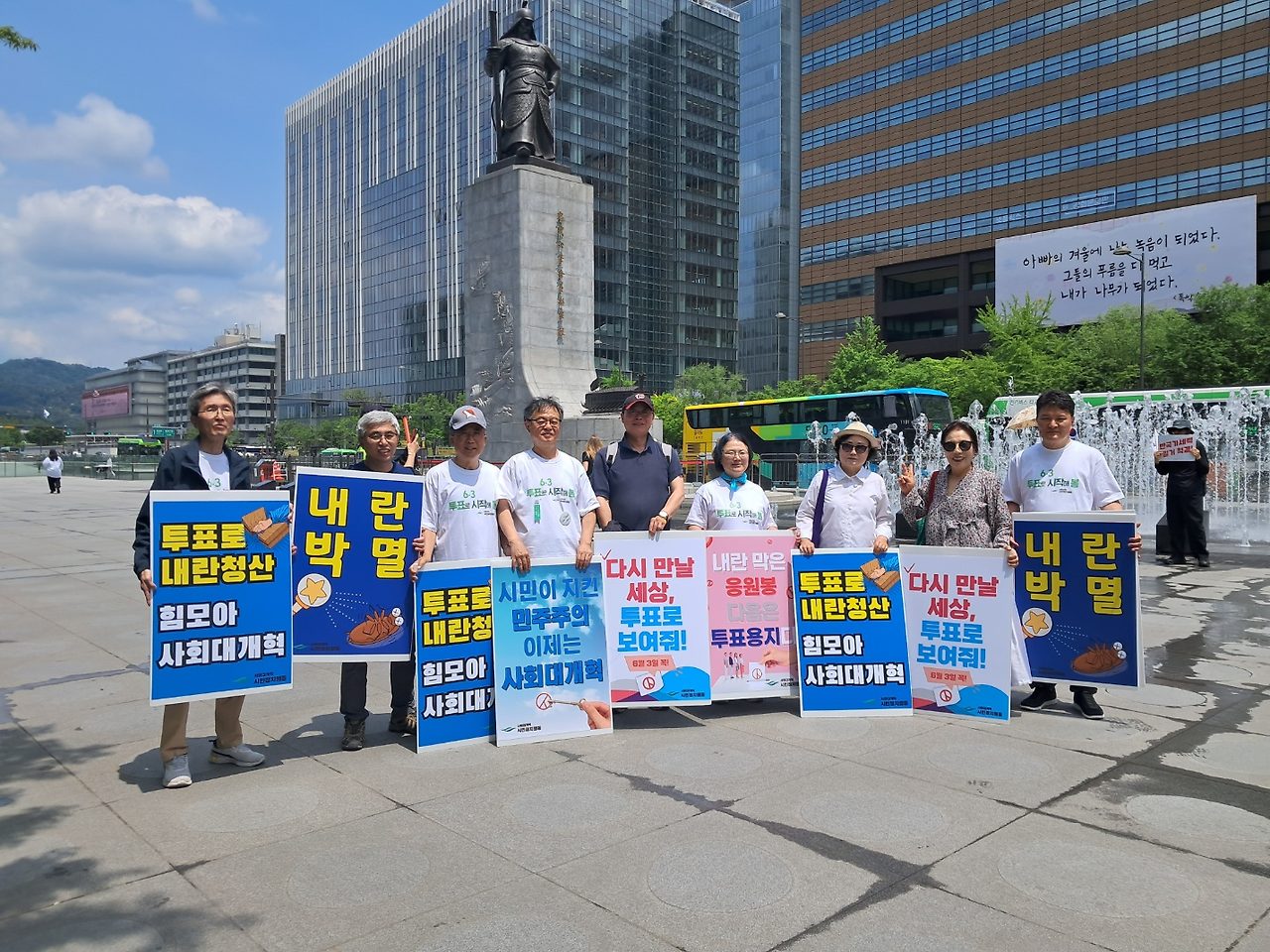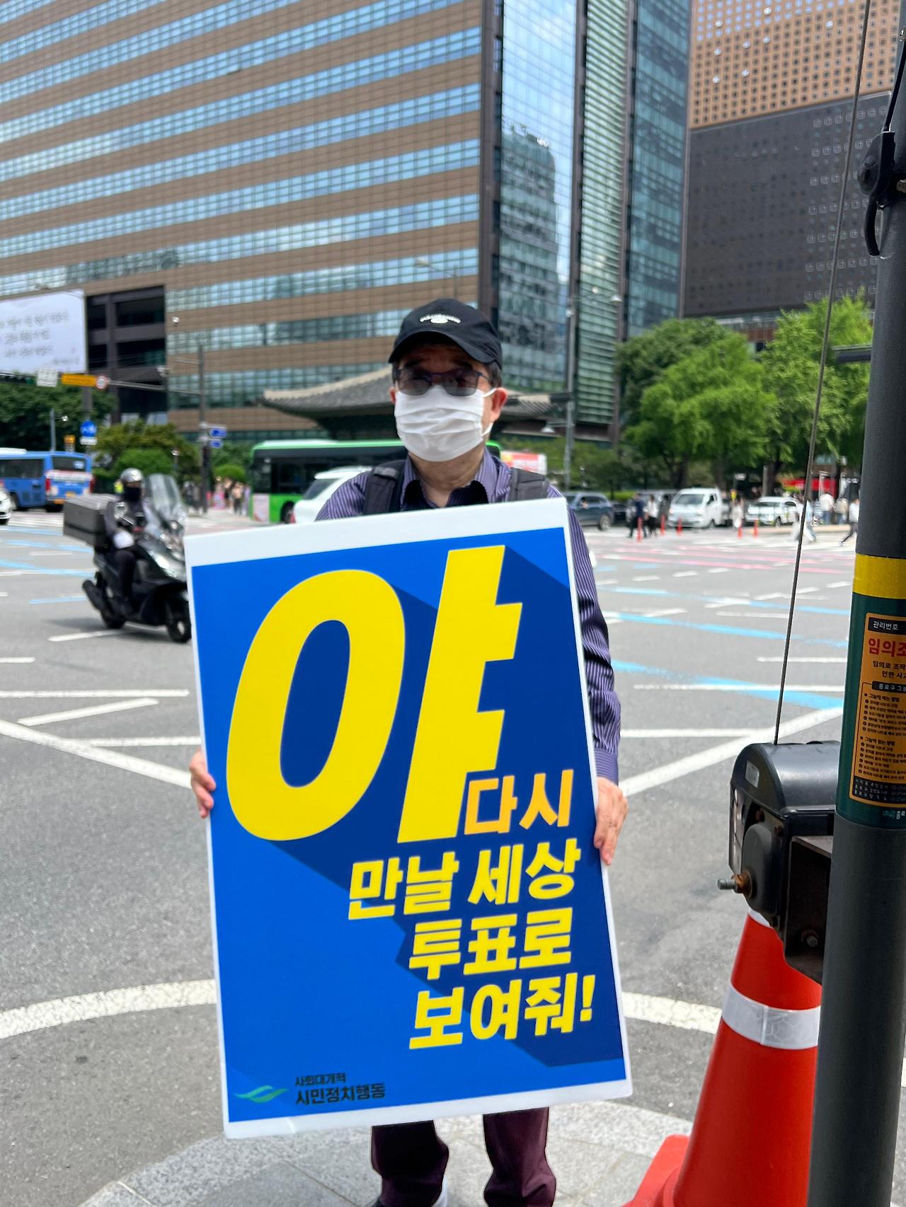 <p data-ke-size="size16">5월 21일 수요일 오전 11시 30분~12시 30분 광화문 일대에서 시민정치행동 유권자운동본부가 2차 유권자운동을 벌였다. 전국비상시국회의, 참교육동지회, 노후희망유니온, 조선일보폐간시민실천단, 전국목회자정의평화협의회 등 참석인원 17명이 함께 했다.그리고 5/23(금) 동시다발 투표참여 피케팅이 있을 예정이다. 대학가, 전철역 등에서 5인조 이상으로 투표참여 캠페인을 진행하시고 사진을 메일로 <span style="color: #333333; text-align: start;">보내주시기 바랍니다.</span> (메일:[email protected]) </p>