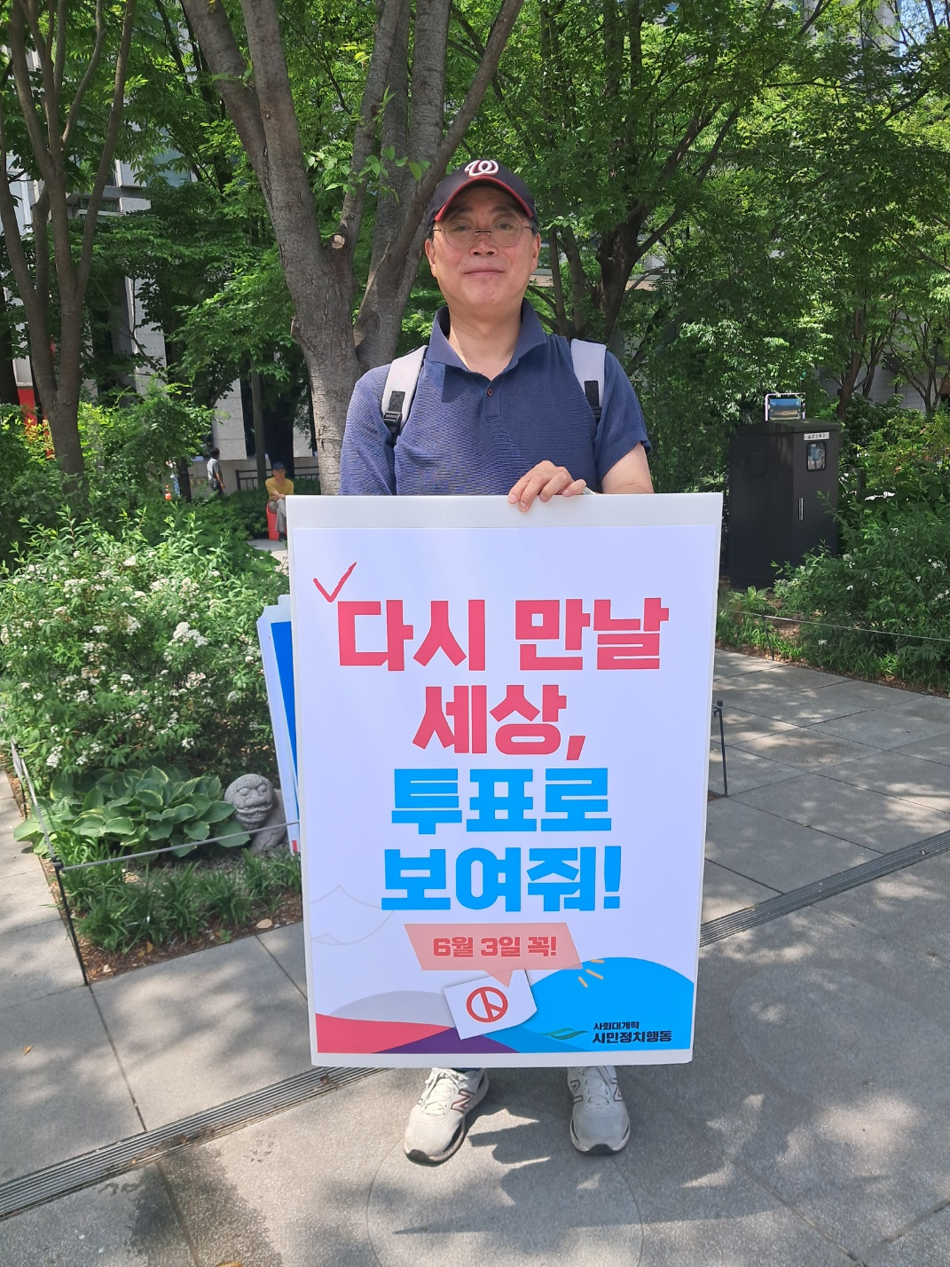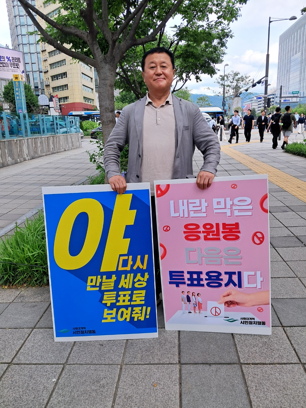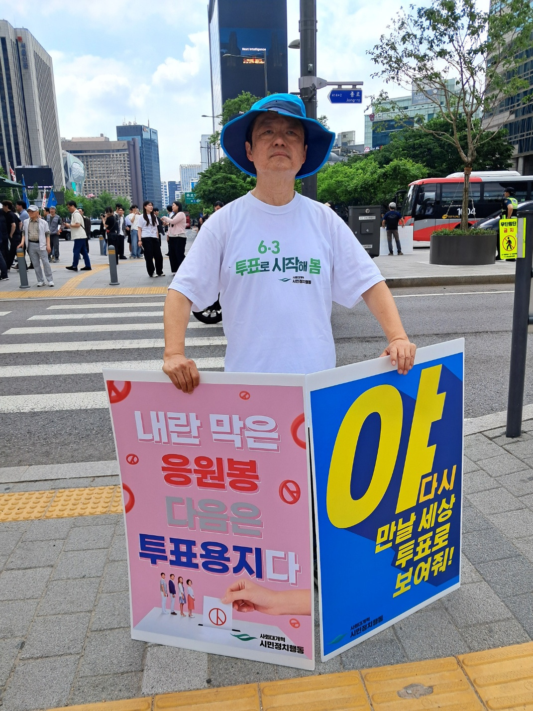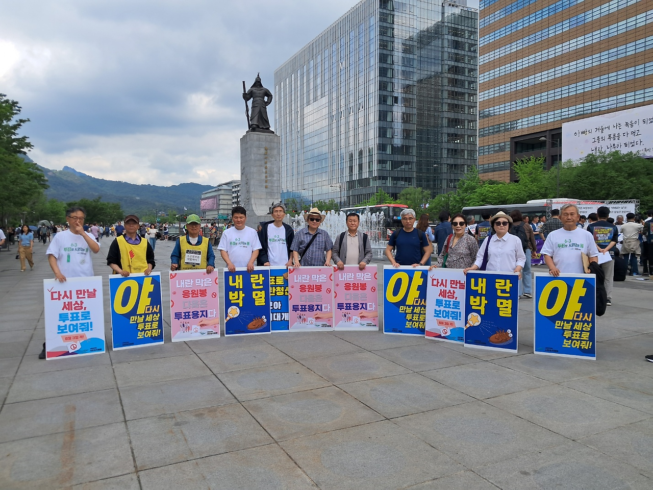 <p data-ke-size="size16">5월 21일 수요일 오전 11시 30분~12시 30분 광화문 일대에서 시민정치행동 유권자운동본부가 2차 유권자운동을 벌였다. 전국비상시국회의, 참교육동지회, 노후희망유니온, 조선일보폐간시민실천단, 전국목회자정의평화협의회 등 참석인원 17명이 함께 했다.그리고 5/23(금) 동시다발 투표참여 피케팅이 있을 예정이다. 대학가, 전철역 등에서 5인조 이상으로 투표참여 캠페인을 진행하시고 사진을 메일로 <span style="color: #333333; text-align: start;">보내주시기 바랍니다.</span> (메일:[email protected]) </p>