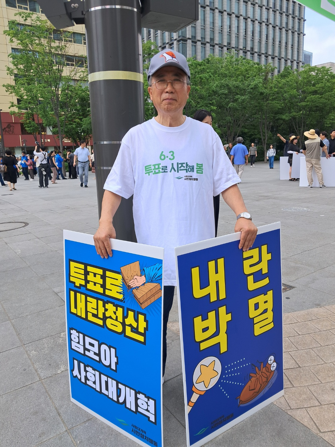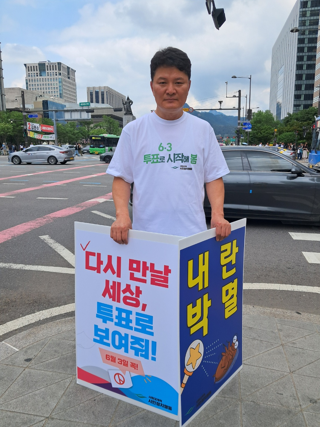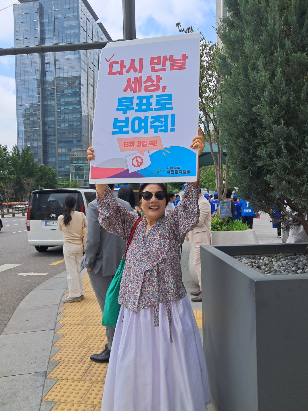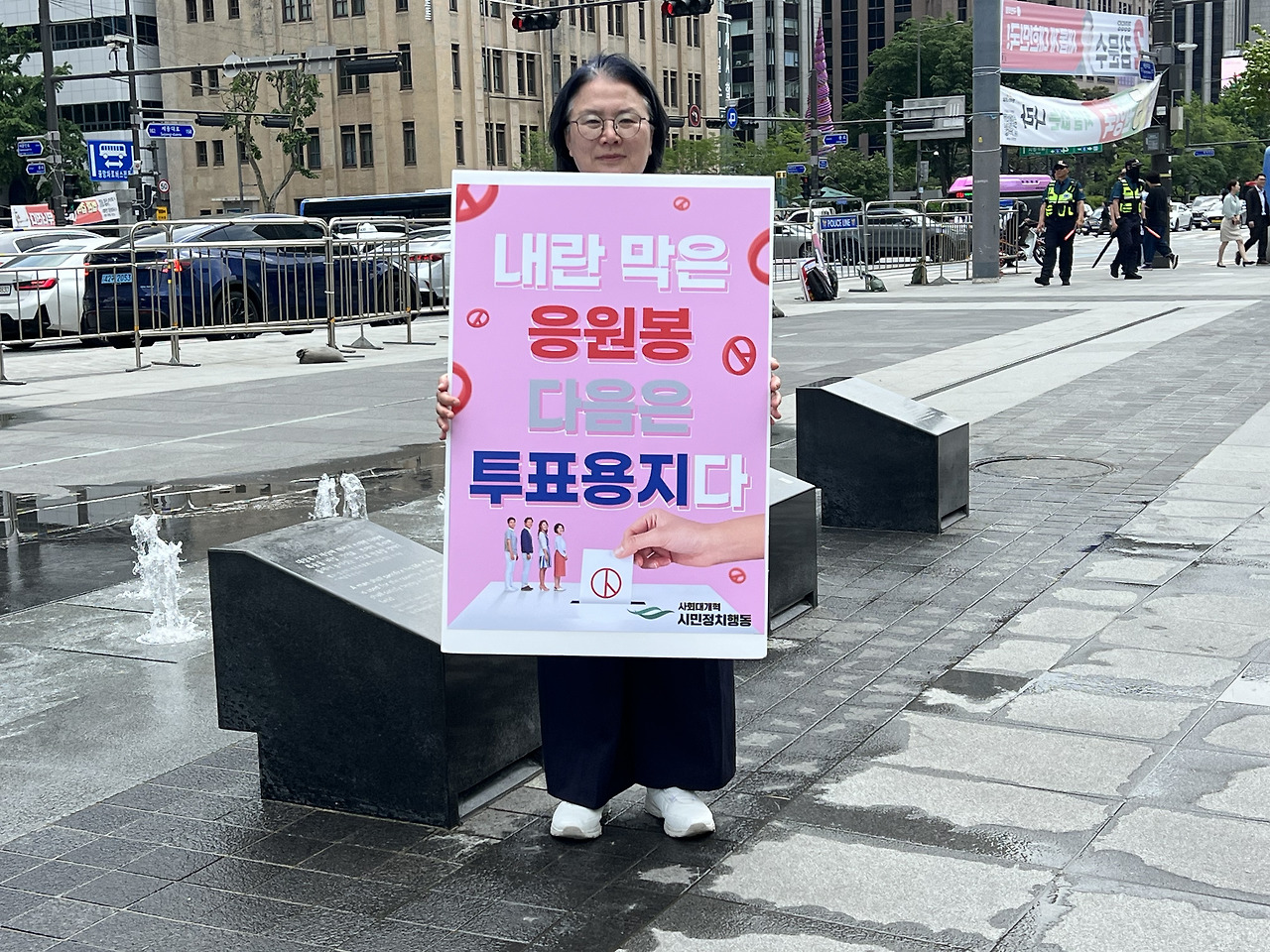 <p data-ke-size="size16">5월 21일 수요일 오전 11시 30분~12시 30분 광화문 일대에서 시민정치행동 유권자운동본부가 2차 유권자운동을 벌였다. 전국비상시국회의, 참교육동지회, 노후희망유니온, 조선일보폐간시민실천단, 전국목회자정의평화협의회 등 참석인원 17명이 함께 했다.그리고 5/23(금) 동시다발 투표참여 피케팅이 있을 예정이다. 대학가, 전철역 등에서 5인조 이상으로 투표참여 캠페인을 진행하시고 사진을 메일로 <span style="color: #333333; text-align: start;">보내주시기 바랍니다.</span> (메일:[email protected]) </p>