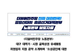 수, 2025/05/21- 00:00 에 admin 에 의해 제출됨 관련 개인/그룹 민주당 중앙당 정당 더불어민주당 지역 미특정 카테고리 보도자료 20250521_민주당_선대위_노동본부_대구_대학가·시장_골목상권_유세활동.pdf공유 공유하기 닫기페이스북트위터카카오톡URL 복사 링크 https://theminjoo.kr/main/sub/news/view.php?sno=0&brd=188&post=1211649&search= Like 0 Dislike 0 1 view 댓글 달기 이름 제목 Comment 저장 Preview Leave this field blank