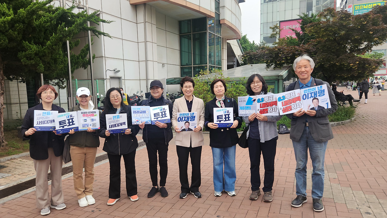 <p data-ke-size="size16">인천광장정치연합에서 5월 20일 '나의 한표로 시작되는 사회대개혁', '내일을 바꾸는 내일...투표', '다시 세울 빛의 나라, 정권교체로 새로운 나라', '미래를 위한 녹색선택, 기후정의 지금 여기에', '6.3투표 내란세력 심판하자', '인천이 낸 이재명' 등의 손 피켓 구호를 들고 유권자운동을 벌였다. </p>