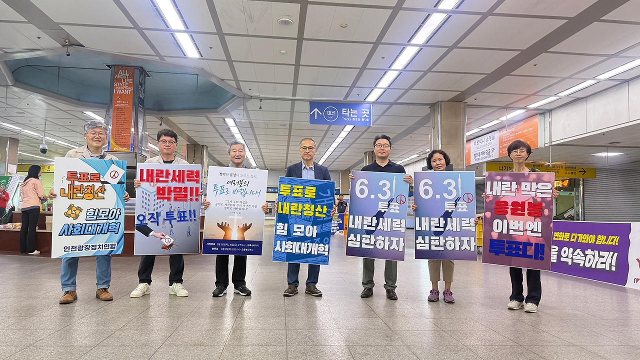 <p data-ke-size="size16">5월 22일 목요일 인천광장정치연합이 부평역에서 '투표로 내란청산 힘모아 사회대개혁', '내란세력 박멸!! 오직 투표!!', '정의와 공정이 흐르는 정치, 여러분의 투표로 바뀝니다.', '투표로 내란청산 힘 모아 사회대개혁', '6.3투표 내란세력 심판하자', '내란 막은 응원봉 이번엔 투표다!', '내일을 바꾸는 내일...투표', '투표는 공짜 미래의 투자', '다시 세울 빛의 나라 정권교체로 새로운 나라', '인천이 낸 이재명', '투표율 꼴지 인천 이번엔 1등으로 바꿉시다.', '다시 주권자의 시간! 광장의 뜻으로 민주주의 회복!', '내란 막은 응원봉 이번엔 투표다', '더 좋은 미래에 투표', '내란세력 척결로 정의로운 대한민국' 등의 문구가 적힌 피켓을 들고 유권자운동을 펼쳤다. </p>