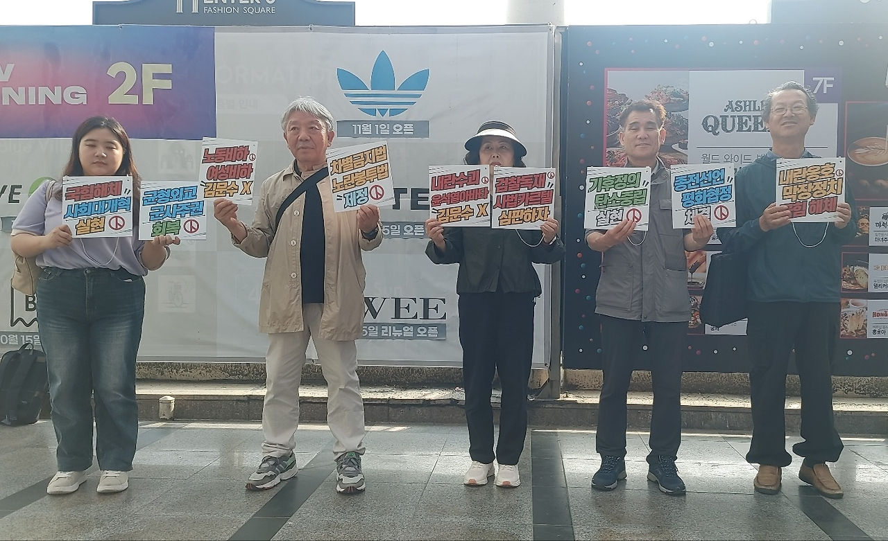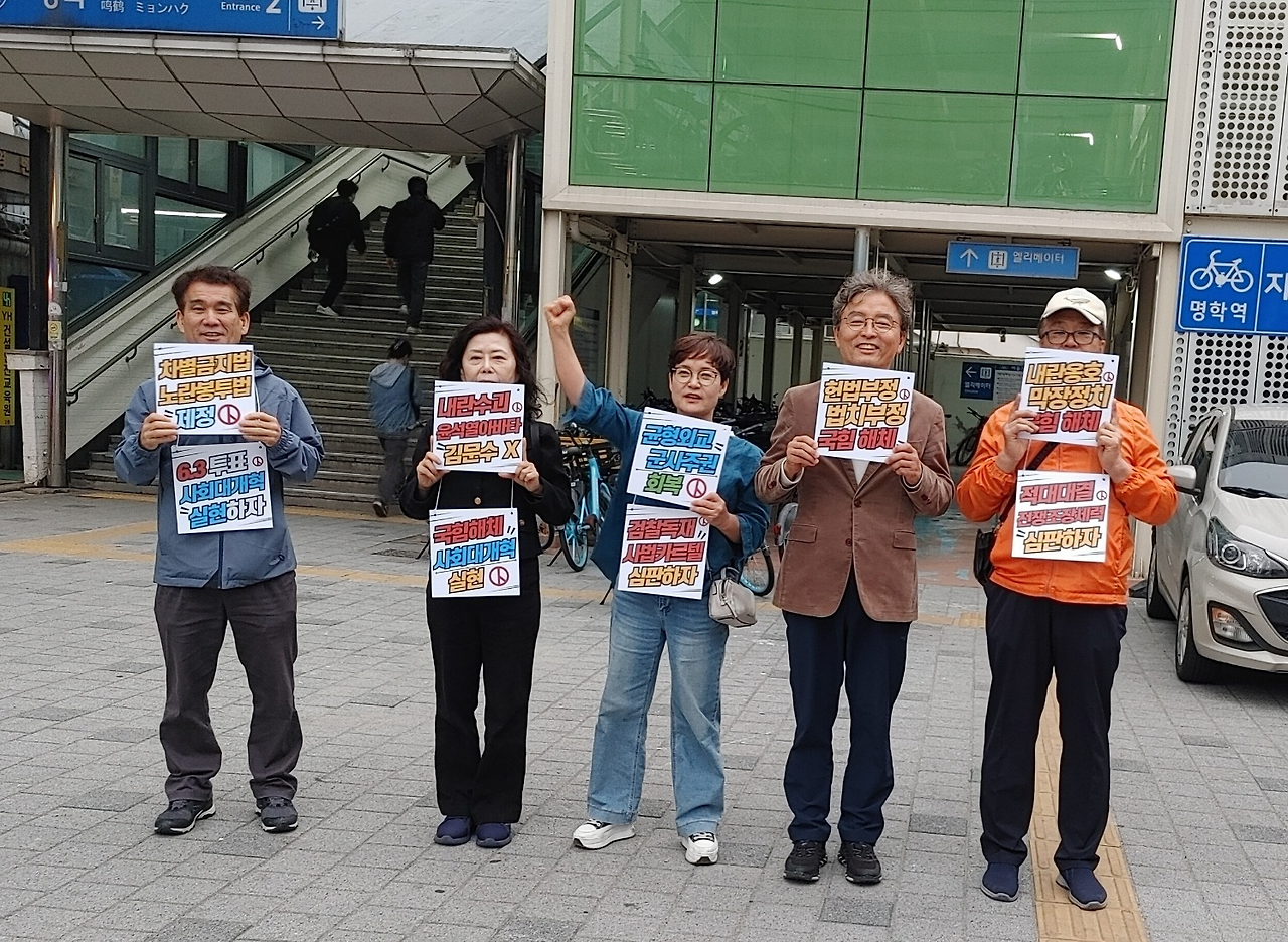 <p data-ke-size="size16">경기중부시민정치행동에서 5.22(목) 명학역 주변에서 '차별금지법 노란봉투법 제정', '6.3투표 사회대개혁 실현하자', '내란수괴 윤석열 아바타 김문수X', '국힘해체 사회대개혁 실현', '균형외교 군사주권 회복', '검찰독재 사법카르텔 심판하자', '헌법부정 법치부정 국힘해체', '내란옹호 막장정치 국힘해체', '적대대결 전쟁조장세력 심판하자', '극우반동 전광훈 아바타 김문수X', '물가폭등 민생파단 국힘심판', '불법계엄 내란세력 심판하자', '종전선언 평화협정 체결', '국힘해체 사회대개혁 실현', '내란옹호 탄핵반대 김문수X', '기후정의 탄소중립 실현' 등의 손피켓을 들고 유권자 운동을 벌였다.</p>