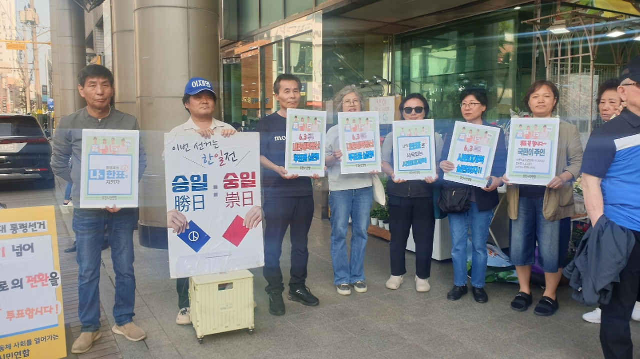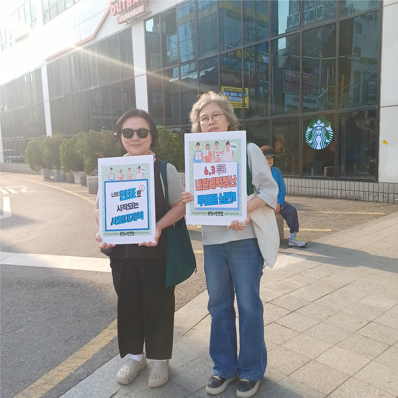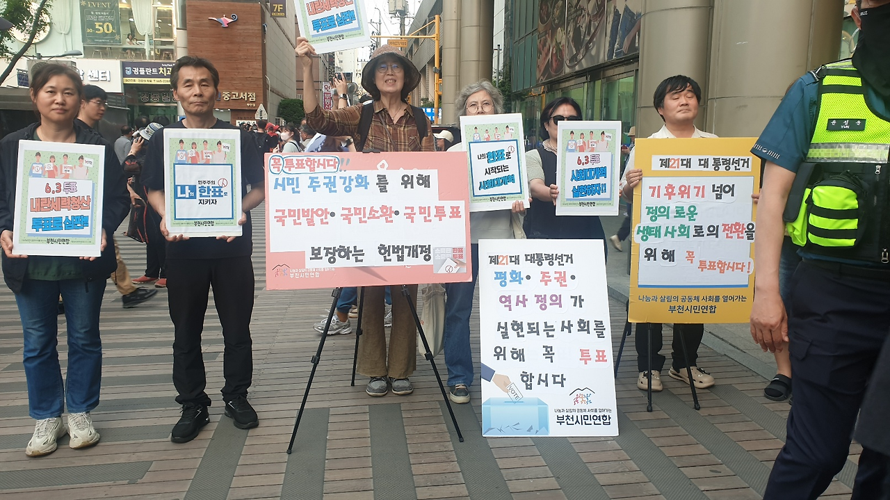 <p data-ke-size="size16">5월 22일 목요일 저녁 5시 30분 ~ 7시 00 부천역 마루광장에서 '부천시민연합', '주권자전국회의 부천지회' 등의 회원들이 '나의 한표로 시작되는 사회대개혁', '6.3투표 내란세력청산 투표로 심판', '민주주의 나의 한표로 지키자', '이번 선거는 한일전 승일, 숭일', '투표 꼭 합시다. 국민이 주인' 등을 구호가 적힌 손피켓을 들고 유권자운동을 펼쳤다. </p>