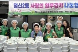 철산2동 새마을지도자협의회(회장 김현규)와 부녀회(회장 황숙자)는 지난 5일 관내 저소득층 이웃을 위해 직접 담근 열무물김치를 전달하는 나눔 행사를 진행했다고 밝혔다.이번 행사에서는 고령자와 신체가 불편한 세대, 저소득 한부모가족 등 총 80가구를 우선 선정해 따뜻한 나눔을 실천했다.행사에 참여한 회원 10여 명은 이른 더위에도 불구하고 전날부터 새마을회관 2층 채움부엌에서 재료를 준비하고 김치를 담갔다.황숙자 회장은 “돌봄이 필요한 이웃에게 정성껏 담근 열무김치를 전할 수 있어 기쁘다”며 “앞으로도 저소득층을 위한 봉사활동을 꾸준