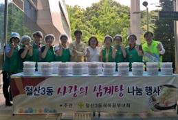 철산3동 새마을부녀회(회장 임순자)는 지난 18일 초복을 맞아 철산3동 행정복지센터 앞마당에서 직접 만든 삼계탕을 폭염 취약계층 40가구에 전달했다고 밝혔다.이날 나눔 행사를 위해 부녀회원들은 이른 아침부터 닭을 손질하고 세척했으며, 엄선한 재료를 넣어 푹 고아 담백하고 영양 가득한 삼계탕을 정성껏 준비했다.임순자 회장은 “무더위에 입맛을 잃기 쉬운 시기일수록 기력 보충을 위해 맛과 영양을 갖춘 음식이 필요하다”며 “정성껏 마련한 삼계탕을 독거어르신 등 취약계층에 제공할 수 있어 매우 기쁘다”고 말했다.권위향 동장은 “폭염 속에서도