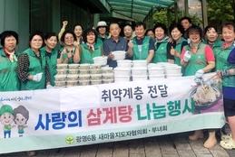 광명6동 새마을지도자협의회(회장 김은성)와 부녀회(회장 이봉금)는 지난 17일 독거 어르신과 어려운 이웃이 건강하게 여름을 보낼 수 있도록 초복맞이 삼계탕 나눔 행사를 진행했다.무더운 날씨에도 새마을지도자와 부녀회원 20여 명은 이른 아침부터 직접 삼계닭을 손질하고 정성껏 삼계탕을 준비해 독거 어르신과 취약계층 45가구에 전달했다.이봉금 부녀회장은 “더운 날씨에 어려운 이웃을 위해 삼계탕을 끓이며 큰 보람을 느꼈다”며 “조금이나마 어르신들의 기력 보충에 도움이 되길 바란다”고 말했다.배형식 동장은 “소외계층을 위해 매년 힘써주는 새