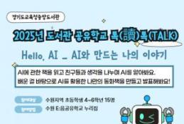 경기도교육청중앙도서관(관장 이승호)이 수원지역 초등학교 4~6학년을 대상으로 ‘2025 도서관 공유학교 톡(讀)톡(TALK)’ 프로그램을 운영한다.6일부터 21일까지 진행되는 이번 공유학교는 참가 학생들이 책을 읽고 토론하며 비판적 사고력과 창의적 표현력을 기르고 인공지능(AI) 주제 강연 및 생성형 인공지능(AI) 체험을 통해 디지털 이해력 등 인공지능(AI) 시대의 핵심 역량을 기를 수 있도록 기획됐다.주요 프로그램은 ‘안녕(Hello), 인공지능(AI) _ 인공지능(AI)과 만드는 나의 이야기’를 주제로 ▲인공지능(AI) 주제