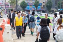 광명시는 통학로 안전 문제가 제기된 광명초등학교 등굣길을 18일 현장 방문했다. 시는 광명초 인근 광명제4·5R구역 재개발 공사로 기존 임시 통학로인 광이로가 폐쇄되어, 약 900m 구간의 새로운 임시 통학로를 정비하고 안전보안관 14명과 교통봉사대 8명을 배치했다.박승원 시장은 안전보안관, 교통봉사대와 함께 광명초등학교 학생들의 안전한 통학을 도왔다.한편, 광명시는 이르면 오는 10월까지 기존 임시 통학로였던 광이로에 보도를 설치해 학생들이 더 빠르고 안전하게 통학할 수 있도록 할 계획이다.