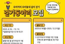 광명시(시장 박승원)는 시민의 건강한 생활습관 형성과 지역 걷기문화 확산을 위해 ‘2025년 우리동네 걷기 동아리’ 참가팀을 18일부터 모집한다.모집 기간은 오는 12월 12일까지이며, 특히 8월 18일부터 8월 31일까지를 집중 모집 기간으로 운영해 시민들의 적극적인 참여를 이끌 계획이다.참가 대상은 광명시에 거주하는 시민으로, 3인 이상으로 팀을 구성해야 한다. 팀은 걷기지도자 1명과 일반 시민 2명 이상으로 구성되며, 걷기지도자는 반드시 1급 또는 2급 자격증을 소지하고 있어야 한다. 신청 시 자격증 사본을 제출해야 한다.참가