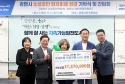 광명시 소상공인들이 지난 7월 발생한 소하동 아파트 화재로 피해를 입은 주민들을 위해 모은 성금 1천 800여만 원을 기탁했다. 시는 지난 5일 오전 시청 중회의실에서 성금 기탁식과 소상공인 간담회를 열었다고 밝혔다.간담회 시작 전 열린 기탁식에서 광명시소상공인연합회(회장 박재철)와 광명시골목상권상인회총연합회(회장 오해석) 회원들은 자발적으로 모금한 성금을 광명희망나기운동본부에 전했다.박재철 회장은 “지역화폐 확대와 민생안정지원금 등 시의 다양한 민생 정책으로 소상공인들이 많은 힘을 얻었다”며 “이제는 우리가 지역사회에 보답할 때라