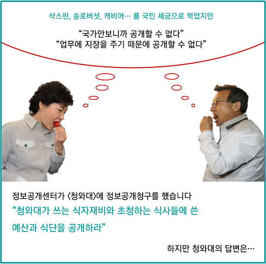 게다가 청와대에서 월별로 식자재비를 얼마나 쓰는지 그 액수를 알면, 혹은 연도별로 조찬, 오찬 등 귀빈접대 식사에 얼마나 쓰는지 그 총액을 알면 국익이 침해되고, 공정한 업무수행에 지장에 생긴다는 것은, 아무리 생각해봐도 망상에 가깝습니다.