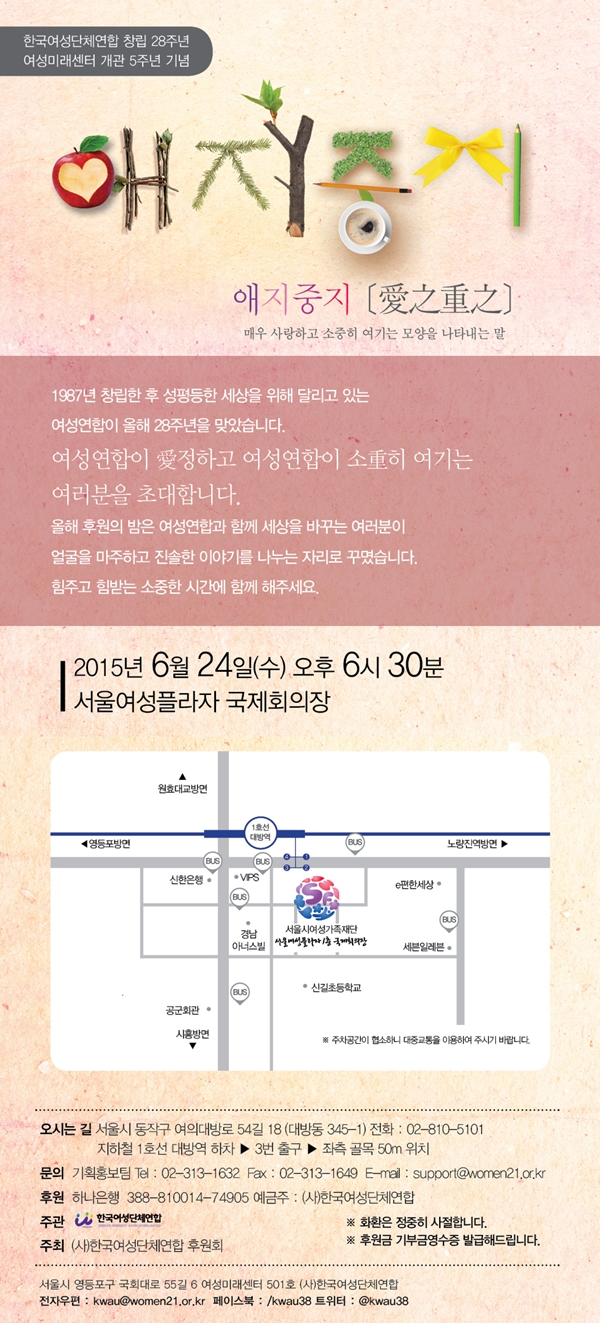 한국여성단체연합 창립 28주년, 여성미래센터 개관 5주년 기념 후원의 밤 '애지중지'는 예정대로 6월 24일(수) 오후 6시 30분부터 서울여성플라자 국제회의장에서 열립니다. 메르스 전염 불안이 해소되지 않고 있어 행사 진행여부에 대해 많이 고민했습니다. 행사장 입구에 열감지기를 설치하고 '네트워크 파티' 프로그램은 대폭 조정하여 어려운 때이지만, 지지와 격려를 아끼지 않으시는 후원인들께 깊이 감사 드리며 오셔서 함께 해주시기 바랍니다. 감사합니다. 한국여성단체연합 후원회장 지은희