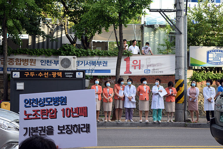 보건의료노조는 7월 9일 오후 6시 30분 인천성모병원 앞에서 <인천성모병원 노동탄압 규탄 집회>를 열었다. 인천성모병원은 지난 7월 1일 보건의료노조 임시대의원대회에서 환자존중 직원존중 노동존중 3대 존중병원 만들기 5대 우선해결사업장으로 선정되었다. 보건의료노조는 2015년 하반기 5대 사업장에 대한 집중투쟁을 전개하기로 결의했다.