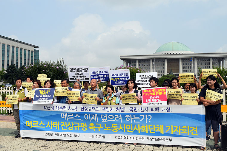 의료민영화·영리화 저지와 의료공공성 강화를 위한 범국민 운동본부, 의료민영화저지와 무상의료실현을 위한 운동본부는 7월 28일 오전 10시, 국회 앞에서 “메르스 사태 진상규명을 촉구 노동시민사회단체 기자회견”을 열었다.