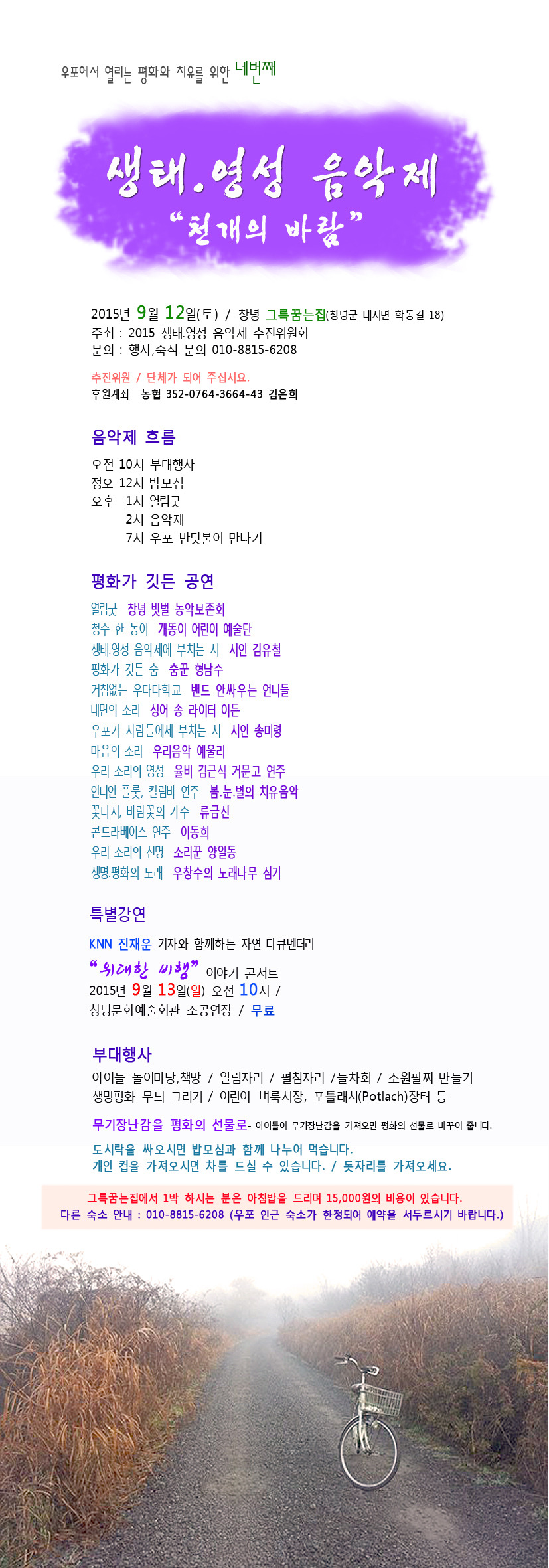 일, 2015/08/23- 14:02 에 익명 (미확인) 에 의해 제출됨 관련 개인/그룹 반핵부산시민대책위 지역 밀양시의령군함안군창녕군 “천개의 바람” 우포에서 네 번째 생태 영성 음악제를 엽니다. 출연진. 프로그램. 숙소안내더불어 추진위원이 되어 주시면 고맙겠습니다. 이 음악제는 순수한 후원금 만으로 만들어 집니다.후원계좌 : 농협 352-0764-3664-43 김은희 링크 http://cafe.naver.com/nonukesbusan/1425 Tags 생태 영성 음악제 천개의 바람 Like 0 Dislike 0 995 views 댓글 달기 이름 제목 Comment 저장 Preview Leave this field blank