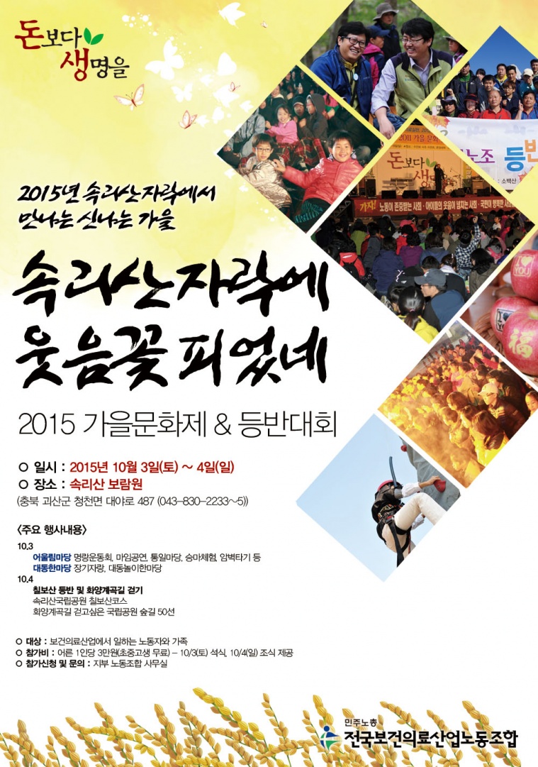 월, 2015/08/24- 14:31 에 익명 (미확인) 에 의해 제출됨 관련 개인/그룹 전국보건의료산업노동조합 지역 영등포구 2015년 가을문화제 포스터 입니다. 링크 http://bogun.nodong.org/xe/index.php?document_srl=350627 Tags 가을문화제 Like 0 Dislike 0 962 views 댓글 달기 이름 제목 Comment 저장 Preview Leave this field blank