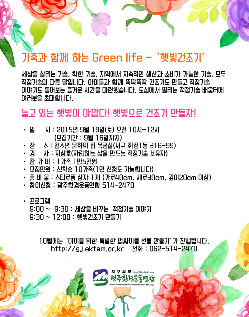수, 2015/08/26- 10:39 에 익명 (미확인) 에 의해 제출됨 관련 개인/그룹 광주환경운동연합 지역 광주 북구 링크 http://gj.ekfem.or.kr/archives/8650 Tags 공지사항 알림마당 햇빛건조기 Like 0 Dislike 0 280 views 댓글 달기 이름 제목 Comment 저장 Preview Leave this field blank