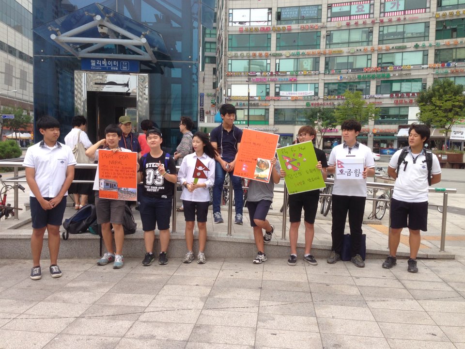 9월 2일에 <네팔 지진 피해 돕기>팀은 직접 우드락에 네팔 지진에 대한 글과 그림을 넣어 홍보지를 만들고 모금함을 준비하여 화정역에 나가서 모금을 하였습니다. 네팔에서 발생한 강진을 생각하며 희생자들을 위한 팔지를 만들고 네팔 사람을 돕기위한 모금 활동도 직접 학생들이 기획한 일이었습니다. 모금 시작할때 쑥스럽기도 하고 부끄럽기도 했지만 시민들의 호응을 접할때면 정말 뿌듯했다고 전해 주었습니다. 하루종일 준비해서 모금된 돈은 저희 이주노동희망센터에 기부 하기로 하였습니다. 창조활동을 기획하고 실행한 덕양중학교 아이들! 참 멋집니다. 모금한 그 돈은 네팔 지진피해 학교 재건하는데 잘 쓰이도록 할것입니다.