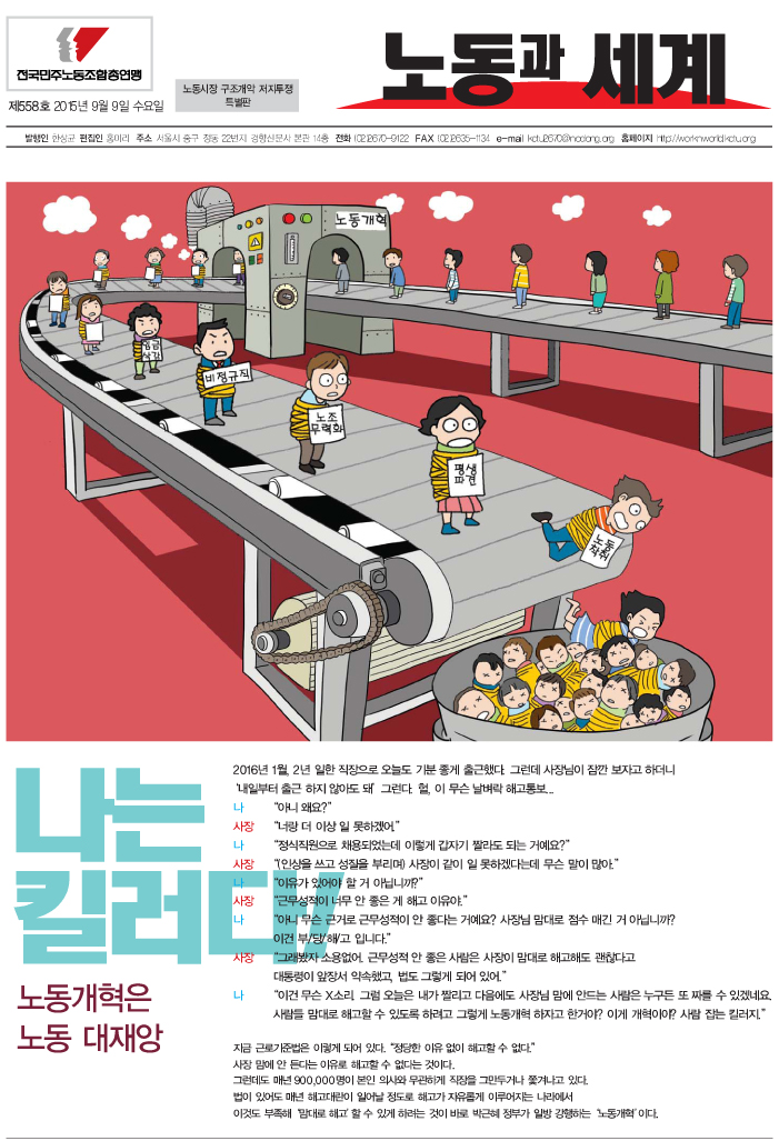 화, 2015/09/08- 09:29 에 익명 (미확인) 에 의해 제출됨 관련 개인/그룹 민주노총 부산지역본부 지역 부산 중구 민주노총 신문 <노동과세계> 558호_노동시장 구조개악 저지투쟁 특별판(시민선전물)을 2015년 9월 9일자로 발행하였습니다. 총연맹 교육선전실에서 선전에 필요한 부수를 미리 신청 받았고 9월 8일까지 각 지역과 현장에 도착합니다. 각급 현장과 단위사업장 등에서 필요하신 대로 활용하시고 노동조합 게시판에도 부착해 주시기 바랍니다. [Reference] : 교선2, 「민주노총부산 - [노동과세계] 558호 노동시장 구조개악 저지 투쟁 특별판」 http://busan.nodong.org/xe/?document_srl=2473125. 링크 http://busan.nodong.org/xe/index.php?document_srl=2473125 Tags 노동과새계 노동과 세계특별판 Like 0 Dislike 0 326 views 댓글 달기 이름 제목 Comment 저장 Preview Leave this field blank