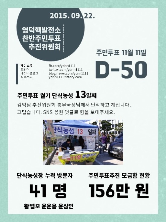 화, 2015/09/22- 18:38 에 익명 (미확인) 에 의해 제출됨 [0] 관련 개인/그룹 영덕핵발전소유치찬반주민투표추진위원회 지역 영양군영덕군봉화군울진군 영덕핵발전소 주민투표(11월 11일) 궐기 단식농성 13일째 입니다. 링크 http://blog.naver.com/ydnn1111/220489026140 Tags 게시판 영덕주민투표 Like 0 Dislike 0 372 views 댓글 달기 이름 제목 Comment CAPTCHA 스펨 사용자 차단 질문 저장 Preview