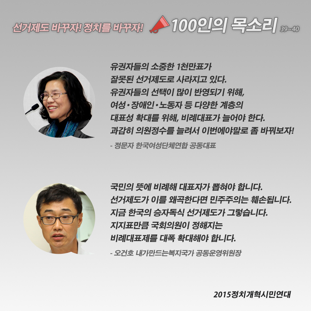 "유권자들의 소중한 1천만표가 잘못된 선거제도로 사라지고 있다. 유권자들의 선택이 많이 반영되기 위해, 여성·장애인·노동자 등 다양한 계층의 대표성 확대를 위해 비례대표가 늘어야 한다. 새누리당과 새정치연합은 지역구가 줄어든다고 엄살부리지 말고 과감히 의원정수를 늘려서 지역구:비례를 2:1로 하면 된다. 이번에야말로 좀 바꿔보자!"