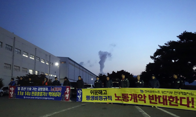 노조 임원과 광주전남지부 간부, 사무처 상무집행위원들이 11월2일 전남 순천과 광양에서 11월14일 전국노동자대회와 총파업을 조직하기 위한 현장순회를 진행했다.노조와 지부 간부들은 이른 새벽 현대제철 순천공장에서 현장순회를 시작했다. 지부 현대제철지회와 현대제철비정규직지회 조합원들이 함께 나와 조합원들에게 박근혜 정권의 노동시장 구조개악 강행을 알리며 14일 전국노동자대회·민중총궐기에 참여하자고 선전했다. 이동원 현대제철지회장은 “현장에 현안이 많지만 11월14일 전국노동자대회를 조직에 집중하겠