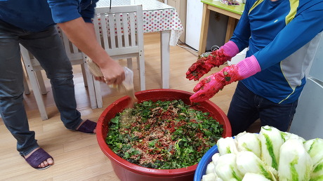 국산 천일염으로 잘 절여진 배추에 배추소양념을 아낌없이 채워주고