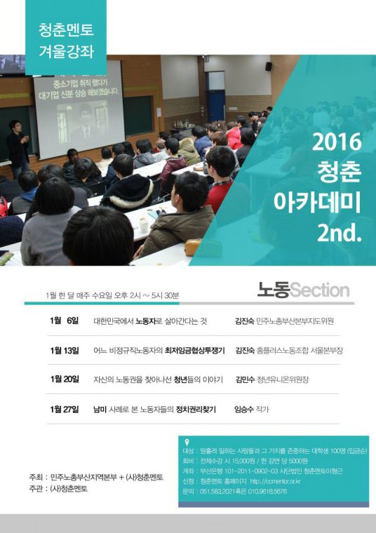 [Reference] : 미조직비정규부장, 「공지사항 - [알림] 2016 청춘아카데미(노동섹션)」 http://busan.nodong.org/xe/?document_srl=2479426.