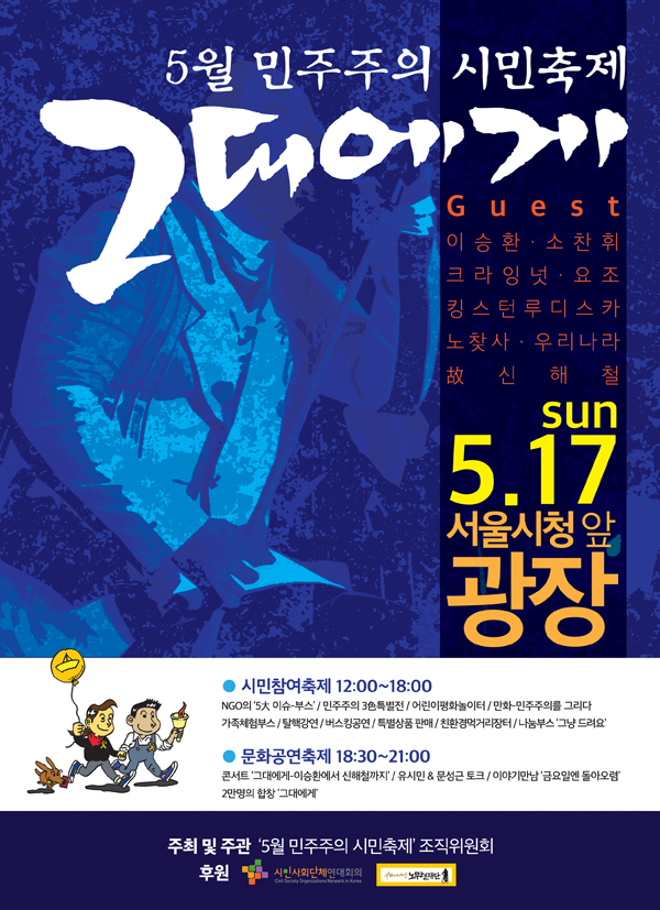 저녁 6시 30분부터는 문화공연 ‘그대에게’가 시작됩니다. 가수 이승환, 소찬휘, 크라잉넛, 요조, 킹스턴루디스카, 노래를 찾는 사람들, 노래패 우리나라 등 쟁쟁한 가수와 그룹들이 무대에 오릅니다. 공연 중간에 갖는 이야기 만남에서는 세월호 유가족·실종자 가족을 모십니다. 이어 문성근, 유시민이 ‘시민의 힘으로’를 주제로 토크마당을 펼칠 예정입니다. 신해철을 영상으로 만납니다. 2년 전 서울광장에서 같이 했던 그와 함께 2만 명의 합창으로 ‘그대에게’를 다시 부르며 축제의 막을 내립니다.
