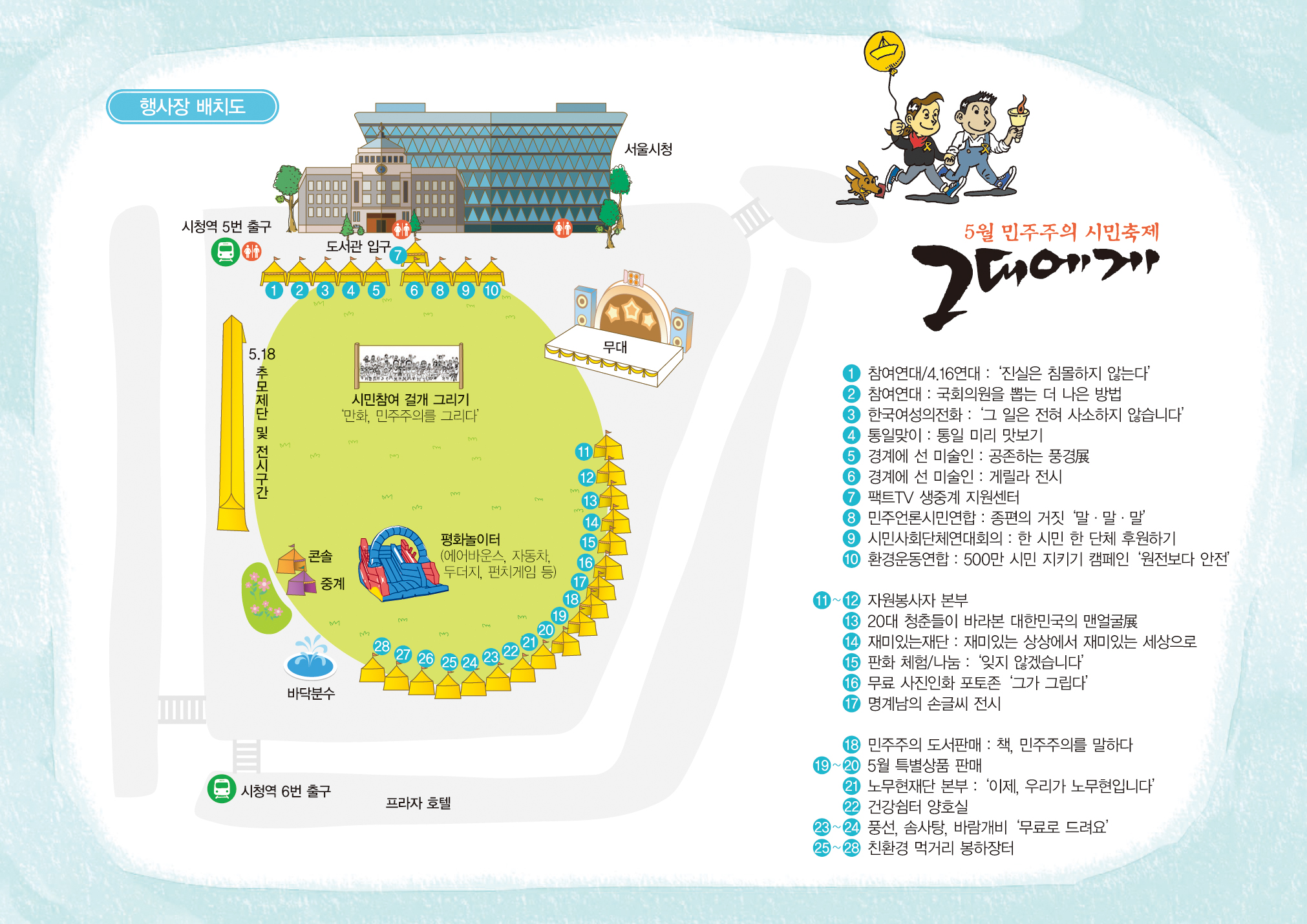서울광장에서 열리는 ‘5월 민주주의 시민축제’가 다가옵니다. 5월 17일, 일요일입니다. 6주기 추모문화제는 처음으로 노무현재단과 시민단체들이 연대해서 꾸미는 자리이지요. 즐길 거리가 더 풍성해졌습니다. 각종 체험·참여 프로그램과 다양한 주제의 전시, 공연, 이벤트까지 하루가 다 모자랍니다.